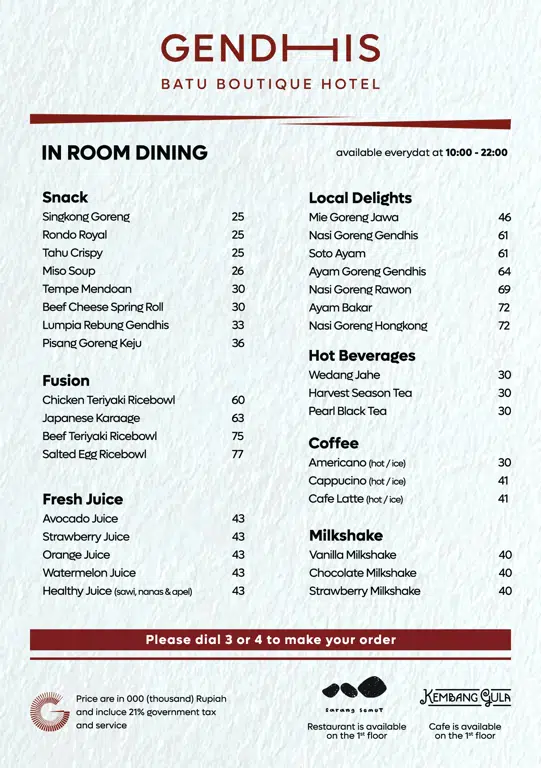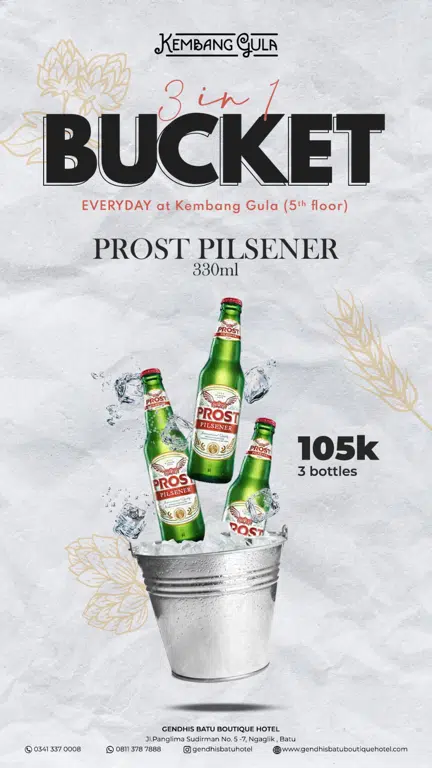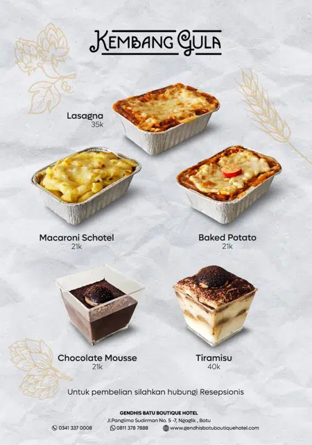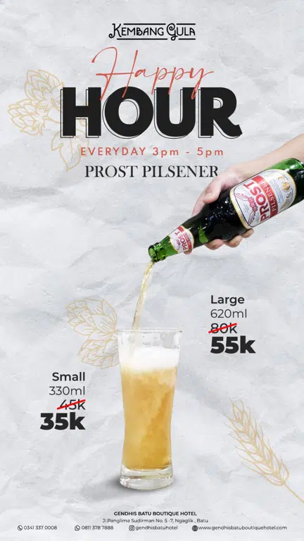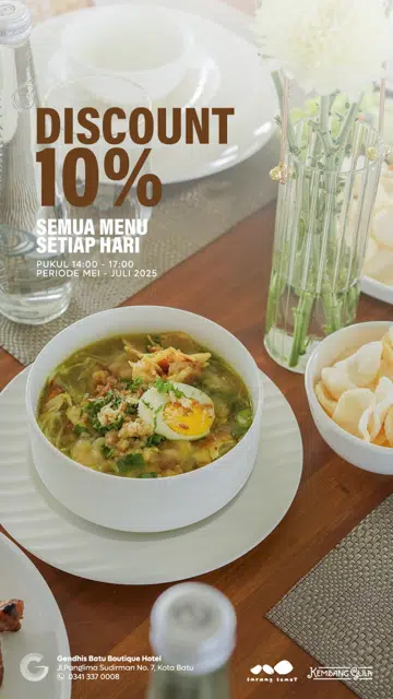 Unwind at Kembang Gula Cafe, located on the 5th floor with stunning views of Mount Arjuno, Mount Panderman, and the refreshing atmosphere of Batu City.